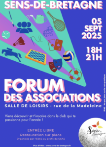 Voir les détails »𝐕𝐞𝐧𝐝𝐫𝐞𝐝𝐢 𝟎𝟔 𝐬𝐞𝐩𝐭𝐞𝐦𝐛𝐫𝐞 Forum des Associations, Ville de Sens-de-Bretagne, à partir de 18h00, Salle de Loisirs , rue de la Madeleine.