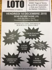 Voir les détails »Le loto des Sections Tennis et Yoga Venez nombreux au loto de SENS DE BRETAGNE le 14 décembre prochain, organisé par les sections tennis et yoga au profit d’un orphelinat « aide aux orphelins de Maman Célestine »