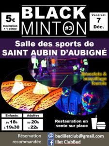 Voir les détails »BLACKminton le vendredi 7 Décembre Le Bad Illet Club Organise pour la 3ème année consécutive sa soirée BLACKminton le vendredi 7 déc. à partir de 18h (enfants) et 20h (adultes) à la salle de sport de Saint-Aubin-d'Aubigné. Venez seul ou entre amis (re)découvrir la pratique du badminton dans le noir ! Une expérience unique à ne pas rater ! Les déguisements et vêtements fluos sont conseillés... Ouvert à tous ! Invitez vos amis et familles à découvrir votre sport dans…